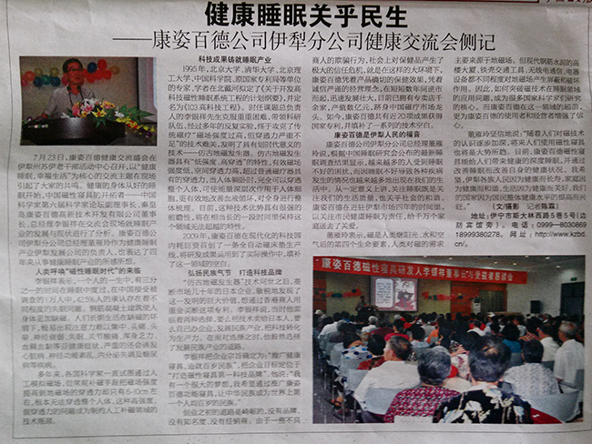 7月23日,康姿百德健康交流盛會在新疆伊犁州蘇伊老干部活動中心舉行,以“健康睡眠、幸福生活”為核心的交流主題引起了與會代表的共鳴。中國磁性寢具的開拓者—第六屆中國科學(xué)家論壇副理事長、秦皇島康姿百德高新技術(shù)開發(fā)有限公司董事長、總經(jīng)理李銀祥就健康睡眠產(chǎn)業(yè)的發(fā)展與現(xiàn)狀進(jìn)行了深入分析??底税俚鹿疽晾绶止究偨?jīng)理董雁玲向與會代表交流了從事健康睡眠產(chǎn)業(yè)四年來的所感所想。7月24日《伊犁晚報(bào)》對此次會議作了題為“健康睡眠、關(guān)乎民生”的專題報(bào)道。