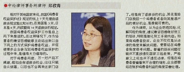 康姿百德集團(tuán)有限公司提出的3個(gè)月無(wú)理由退貨,是指消費(fèi)者在購(gòu)買(mǎi)產(chǎn)品后3個(gè)月以?xún)?nèi),只要消費(fèi)者想退貨,不需要任何理由,不需要任何原因,我們都會(huì)辦理退貨,而且不收退貨費(fèi)和折舊費(fèi),也就是說(shuō)給消費(fèi)者90天后悔期,從根本上保護(hù)了消費(fèi)者的權(quán)益。