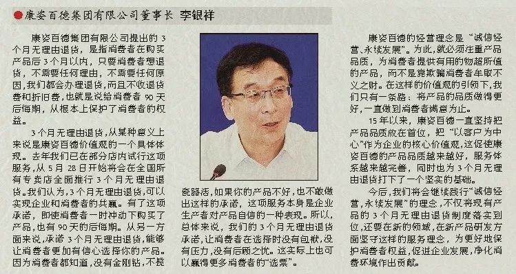 誠(chéng)信贏天下。在當(dāng)今的誠(chéng)信經(jīng)濟(jì)時(shí)代,創(chuàng)新、創(chuàng)意、差異化是每一個(gè)企業(yè)追求的情懷??底税俚鹿咎岢龅?個(gè)月無(wú)理由退貨制度,反映了他們以消費(fèi)者為本的精神,真誠(chéng)希望他們能夠履行這項(xiàng)莊嚴(yán)的承諾,希望李銀祥董事長(zhǎng)做一位創(chuàng)造價(jià)值的企業(yè)家,弘揚(yáng)企業(yè)家的創(chuàng)新精神、工匠精神和敬業(yè)精神。真正的企業(yè)家應(yīng)以家國(guó)情懷、以民族興旺為己任,以時(shí)代擔(dān)當(dāng)和奉獻(xiàn)為最大追求,以滿(mǎn)足人民、滿(mǎn)足社會(huì)對(duì)行業(yè)、對(duì)產(chǎn)品最大的價(jià)值取向?yàn)槟繕?biāo)。