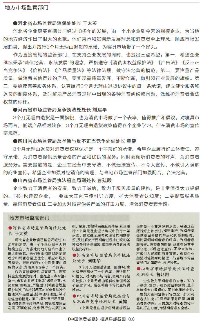 中國(guó)消費(fèi)者報(bào)訊 為構(gòu)建良好的消費(fèi)環(huán)境,規(guī)范寢具市場(chǎng)秩序,推動(dòng)寢具行業(yè)自律和健康發(fā)展,由中國(guó)消費(fèi)者報(bào)社主辦、康姿百德集團(tuán)有限公司協(xié)辦的“寢具市場(chǎng)秩序與消費(fèi)者權(quán)益保護(hù)”座談會(huì)于2019年5月28日在北京召開(kāi),來(lái)自國(guó)家市場(chǎng)監(jiān)督管理總局相關(guān)司局、中國(guó)企業(yè)家協(xié)會(huì)的相關(guān)領(lǐng)導(dǎo)、專(zhuān)家及寢具知名企業(yè)代表,圍繞消費(fèi)者權(quán)益保護(hù)、促進(jìn)寢具市場(chǎng)良性競(jìng)爭(zhēng)與規(guī)范發(fā)展等話(huà)題進(jìn)行了深入探討。本次座談會(huì)上,與會(huì)代表共同見(jiàn)證了康姿百德公司承諾“3個(gè)月無(wú)理由退貨”啟動(dòng)儀式。