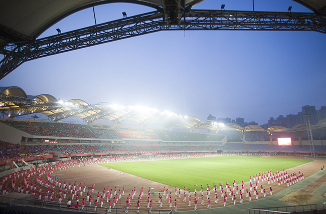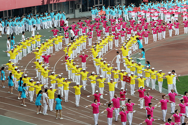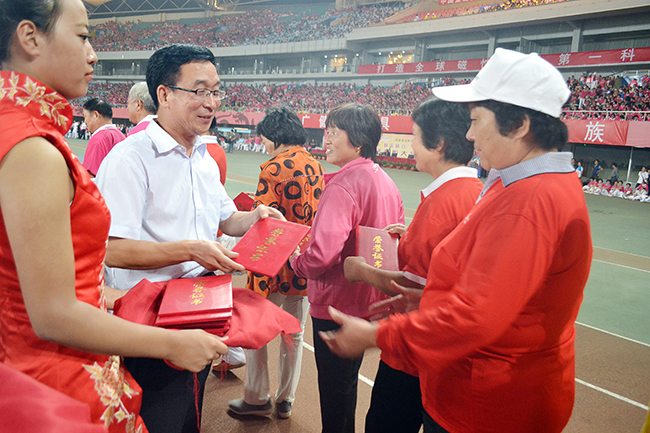督導(dǎo)師進(jìn)行紅旗表演 康姿百德健身操表演,是這次活動(dòng)中檢閱和展示全民健身成果的重要內(nèi)容,也是最為引人注目的重頭戲。20多個(gè)省、市、自治區(qū)的8000多名康姿百德健身操愛好者,組成188個(gè)代表隊(duì)先后入場,表演隊(duì)伍浩浩蕩蕩、首尾相連,偌大的體育場瞬時(shí)變成一個(gè)舞的海洋。參賽隊(duì)員中年齡最大的72歲,最小的只有9歲,大家雖然經(jīng)歷了長途跋涉的旅途勞頓,但個(gè)個(gè)精神飽滿、熱情高漲,橫平豎直、整齊優(yōu)美的表演,帶給全場觀眾以美的享受,向人們傳遞著積極向上、健康文明的生活方式,贏得了全場觀眾的陣陣掌聲。經(jīng)過6個(gè)多小時(shí)的精彩表演,在評委們公正認(rèn)真的打分評判下,比賽共產(chǎn)生一等獎(jiǎng)2個(gè),二等獎(jiǎng)6個(gè),三等獎(jiǎng)9個(gè)。