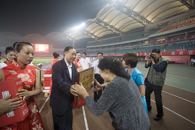 康姿百德公司董事長、總經(jīng)理李銀祥為獲得一等獎(jiǎng)的代表隊(duì)頒發(fā)獎(jiǎng)品