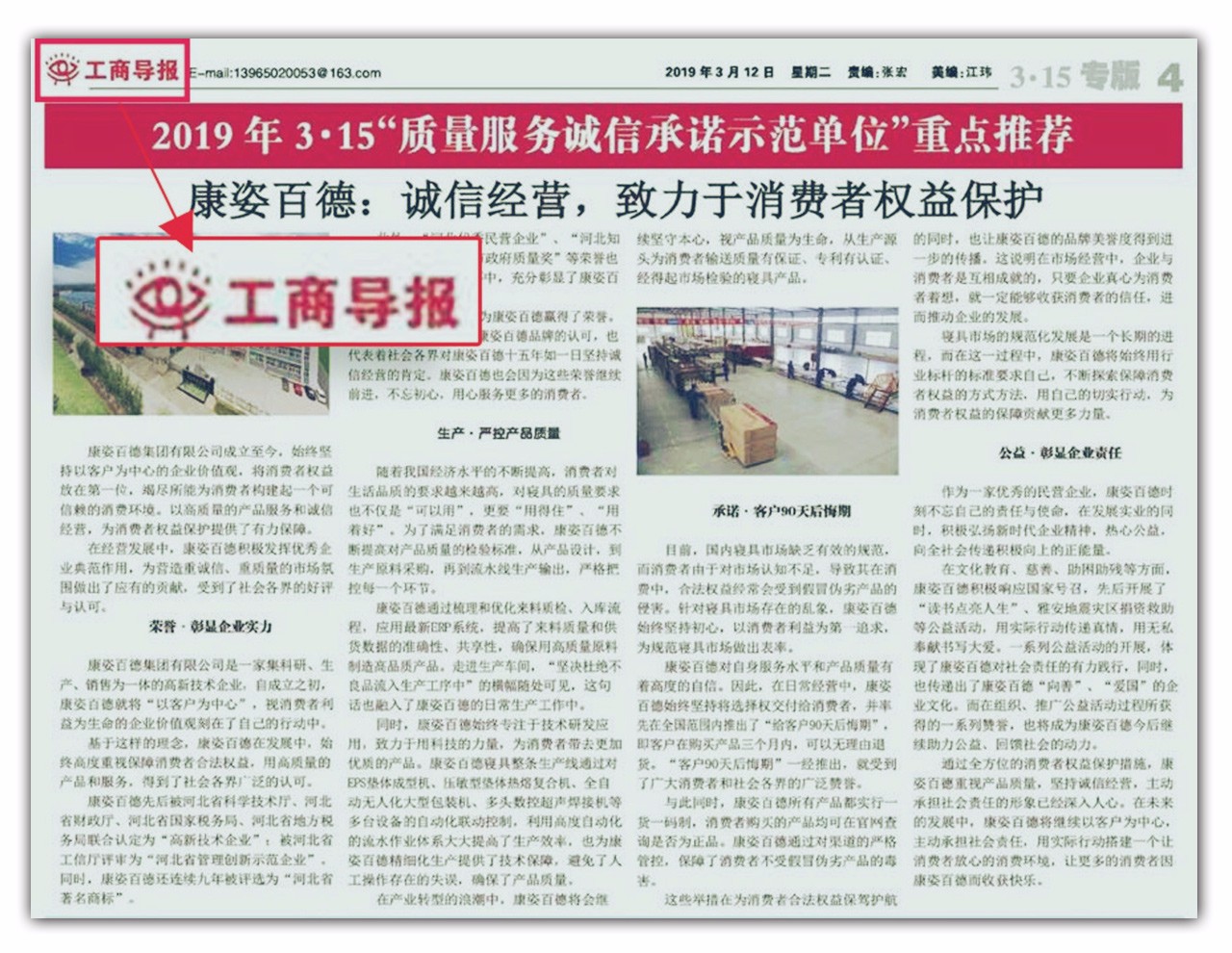 3·15消費(fèi)者權(quán)益日來臨之際,康姿百德受邀參加2019紀(jì)念“3?15”國際消費(fèi)者權(quán)益日座談會,《中國消費(fèi)者報》等多家權(quán)威媒體也相繼對康姿百德進(jìn)行報道。