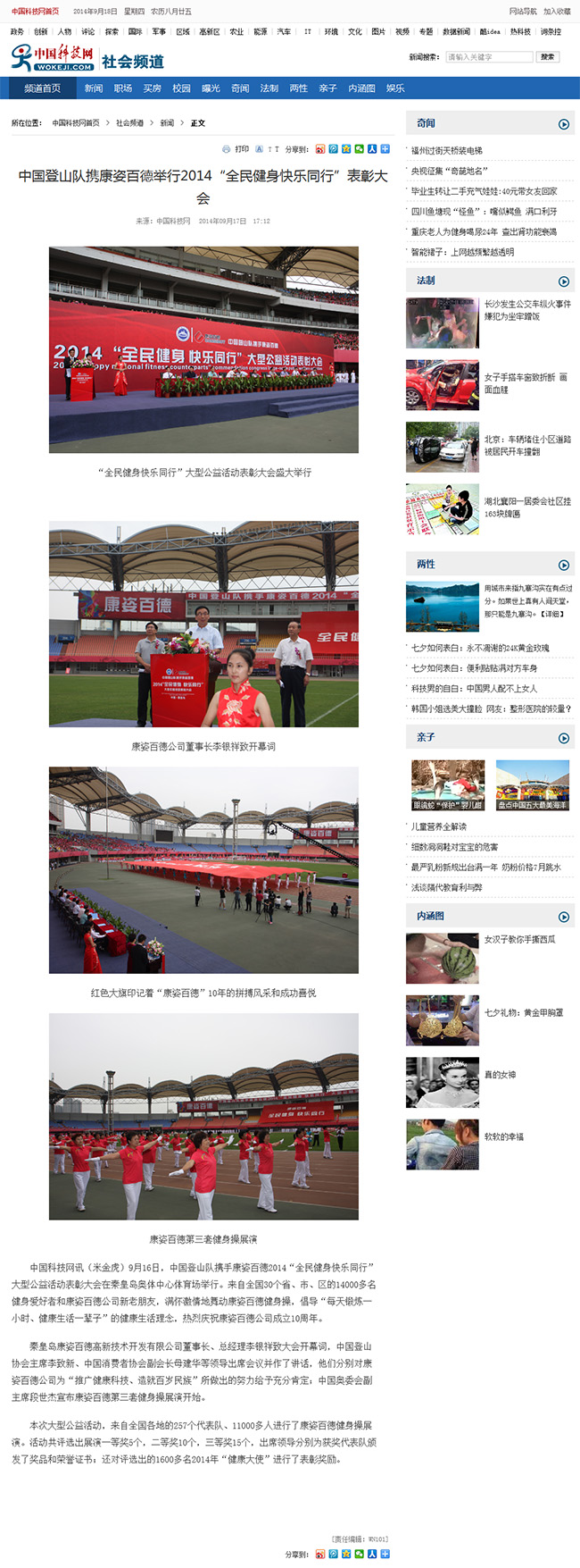 中國(guó)科技網(wǎng)對(duì)2014“全民健身 快樂(lè)同行”大型公益活動(dòng)表彰大會(huì)進(jìn)行報(bào)道。