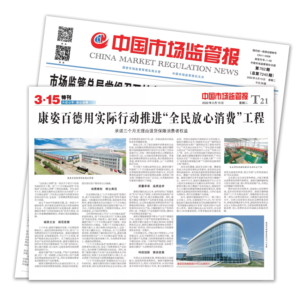 《中國市場監(jiān)管報》由國家市場監(jiān)督管理總局主管,是一張面向全國工商行政管理和市場監(jiān)管部門系統(tǒng)、廣大工商企業(yè)和消費者讀者的經(jīng)濟法制類報紙,是宣傳工商行政管理工作、詮釋工商行政管理法律法規(guī)的權威媒體??底税俚履軌驑s登《中國市場監(jiān)管報》,說明康姿百德在消費者維權方面所做出的突出貢獻,得到了社會各界的充分肯定,也贏得了廣大消費者的贊譽。