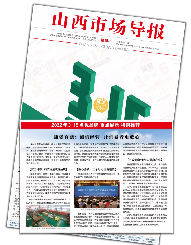 《山西市場導報》以“康姿百德:誠信經(jīng)營 讓消費者更放心”為主題對康姿百德的報道。《山西市場導報》是由山西省工商行政管理局主管主辦的機關報。