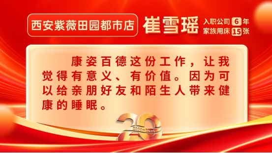 在加入康姿百德之前,崔雪瑤就了解過康姿百德產品,軟硬適中,不易變形,品質有保障。于是在入職第一個月就買了第1張床墊。隨著來公司的時間越來越久,崔雪瑤覺得產品質量是真的好,并將產品推薦給親朋好友。如今,這些親朋好友已累計使用15張康姿百德床墊。在康姿百德工作這幾年,崔雪瑤也覺得這份工作有意義、有價值,因為這份工作可以給親朋好友和陌生人帶來健康的睡眠。尤其是聽著顧客向她講述康姿百德床墊睡著非常舒服,并且把這么好的產品不斷推薦給身邊人,如今身邊使用康姿百德床墊的人越來越多。崔雪瑤聽后內心更是滿滿的自豪感!她表示,作為一名康姿百德人,真的非常地驕傲和幸福!