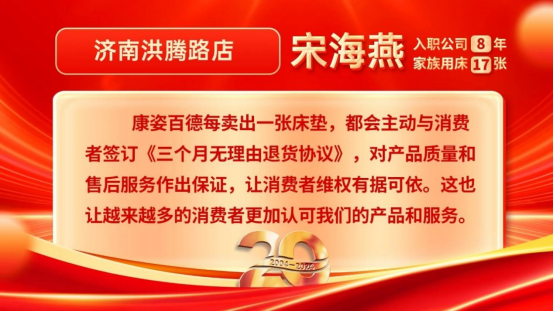 宋海燕表示,因?yàn)樵诳底税俚逻@樣一個(gè)講誠(chéng)信、負(fù)責(zé)任的企業(yè)工作,讓廣大消費(fèi)者都更加信任她,這讓宋海燕也非常自豪。她也表示,作為康姿百德的一員,今后,會(huì)以更加飽滿(mǎn)的熱情和責(zé)任心,全心全意地服務(wù)好每一位客戶(hù),讓大家都能感受到她的真心和誠(chéng)意。