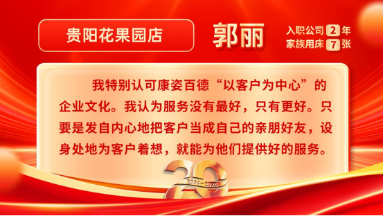 康姿百德20周年專賣店員工的系列故事會(huì)持續(xù)推出,讓我們一起期待其他地區(qū)專賣店員工代表的精彩故事吧!