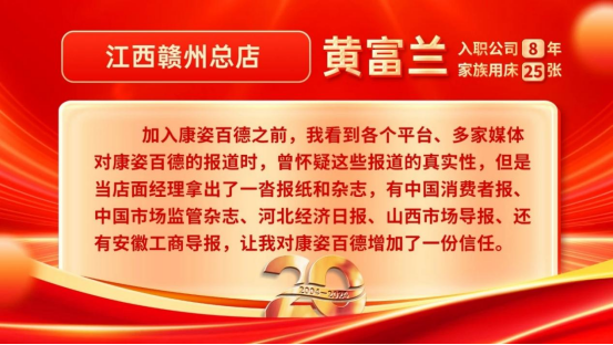 據(jù)黃富蘭回憶,在加入康姿百德時(shí)有一個(gè)小插曲。“當(dāng)時(shí)是想找份工作,正好看到康姿百德門店在招聘店員,走進(jìn)去后店面經(jīng)理正給應(yīng)聘者做企業(yè)介紹,還介紹到了多家媒體對(duì)康姿百德進(jìn)行過報(bào)道。當(dāng)時(shí)我看到各個(gè)平臺(tái)、多家媒體對(duì)康姿百德的報(bào)道時(shí),曾懷疑這些報(bào)道的真實(shí)性,擔(dān)心是門店作假。店面經(jīng)理看出了我的顧慮,拿出了一沓報(bào)紙和雜志,有中國消費(fèi)者報(bào)、中國市場(chǎng)監(jiān)管雜志、河北經(jīng)濟(jì)日?qǐng)?bào)、山西市場(chǎng)導(dǎo)報(bào)、還有安徽工商導(dǎo)報(bào),讓我對(duì)康姿百德增加了一份信任?!?/span>