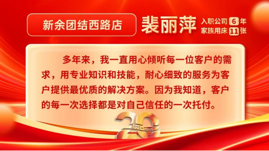 今年是康姿百德集團(tuán)成立20周年。在20年的發(fā)展歷程中,有這樣一群人,他們?cè)谑袌?chǎng)經(jīng)營管理過程中,深刻貫徹以客戶為中心的理念,始終把優(yōu)質(zhì)的服務(wù)融于門店經(jīng)營的每個(gè)環(huán)節(jié),也因此得到了客戶的贊賞和認(rèn)可。他們就是康姿百德專賣店的員工。本期和您分享的是康姿百德江西地區(qū)專賣店員工代表的故事。