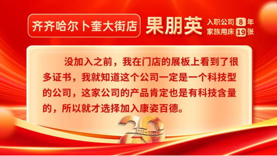 談到為什么加入康姿百德,果朋英說(shuō)道:“沒(méi)加入之前,我在門店的展板上看到了很多證書(shū),我就知道這個(gè)公司一定是一個(gè)科技型的公司,這家公司的產(chǎn)品肯定也是有科技含量的,所以就才選擇加入康姿百德?!?/span>