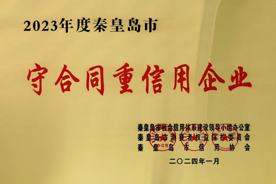 康姿百德集團(tuán)榮獲“秦皇島市守合同重信用企業(yè)”、“秦皇島市信用協(xié)會(huì) 第一屆理事會(huì)副會(huì)長(zhǎng)單位”榮譽(yù)稱號(hào)