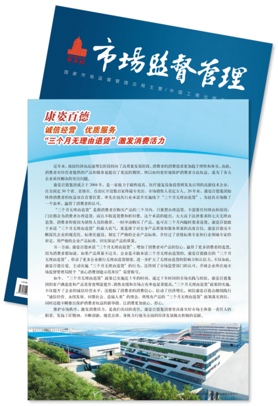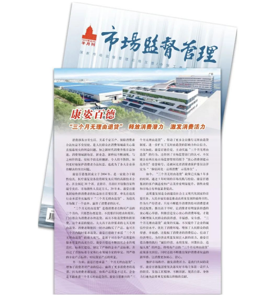 今年12月,《市場監(jiān)督管理》半月刊專題報道再次以《康姿百德“三個月無理由退貨”--釋放消費潛力 激發(fā)消費活力》為題,全面、詳細地報道了康姿百德。《市場監(jiān)督管理》半月刊對康姿百德的多次專題報道,是對康姿百德的認可,也是激勵??底税俚聦⒁蝗缂韧貓猿终\信經(jīng)營,不斷提升產(chǎn)品和服務(wù)質(zhì)量,為寢具市場在保障消費者權(quán)益方面做出表率,帶動更多企業(yè)推行無理由退貨制度,為經(jīng)濟高質(zhì)量發(fā)展做出新的貢獻。